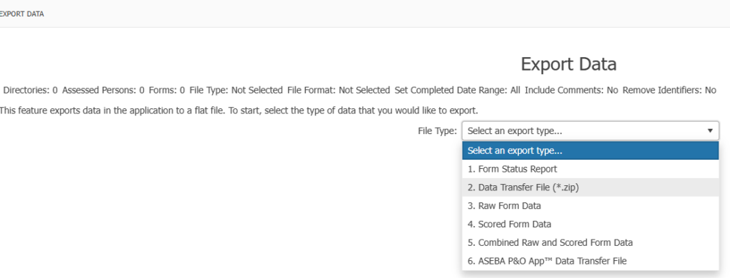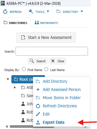 Once logged into the program, please RIGHT click on the Root folder at the top left and choose Export Data, then choose ASEBA Data Transfer, and click Next.