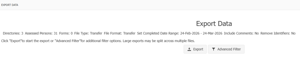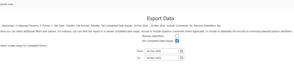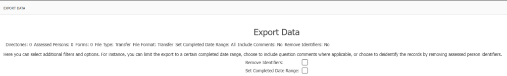 There is a choice of checking Remove Identifiers and Set Completed Date Range. Leave unchecked to export the entire database.