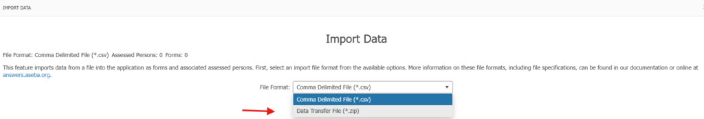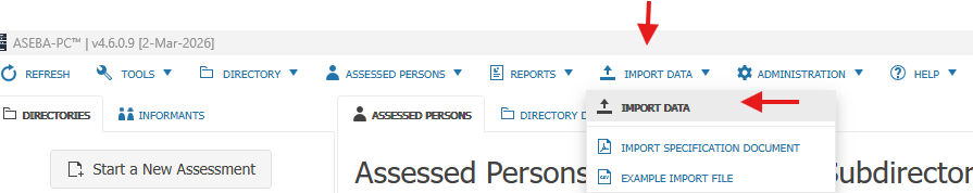 Log into the ASEBA-PC program on the newer computer to import the data. Click on Import Data, Import Data.