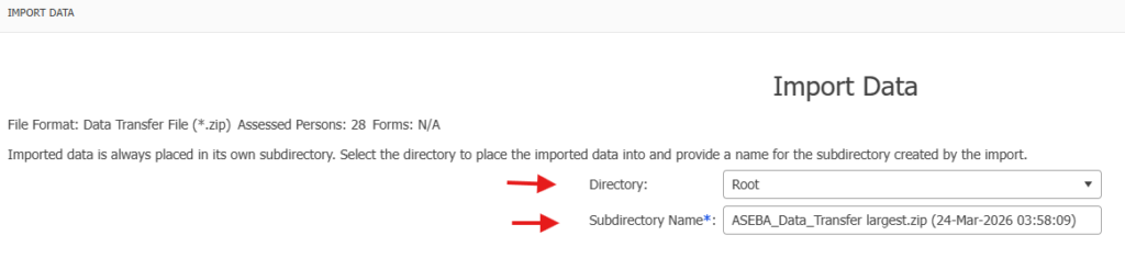 Select the Directory to import the file to. Renaming the Subdirectory Name is an option, otherwise the default will be ASEBA_Data_Transfer.zip