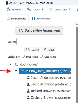 The data will be imported under the DIRECTORIES tab with the name ASEBA_Data_Transfer.zip with the date and time of import. Expand the folder to see the assessed persons and their forms.
