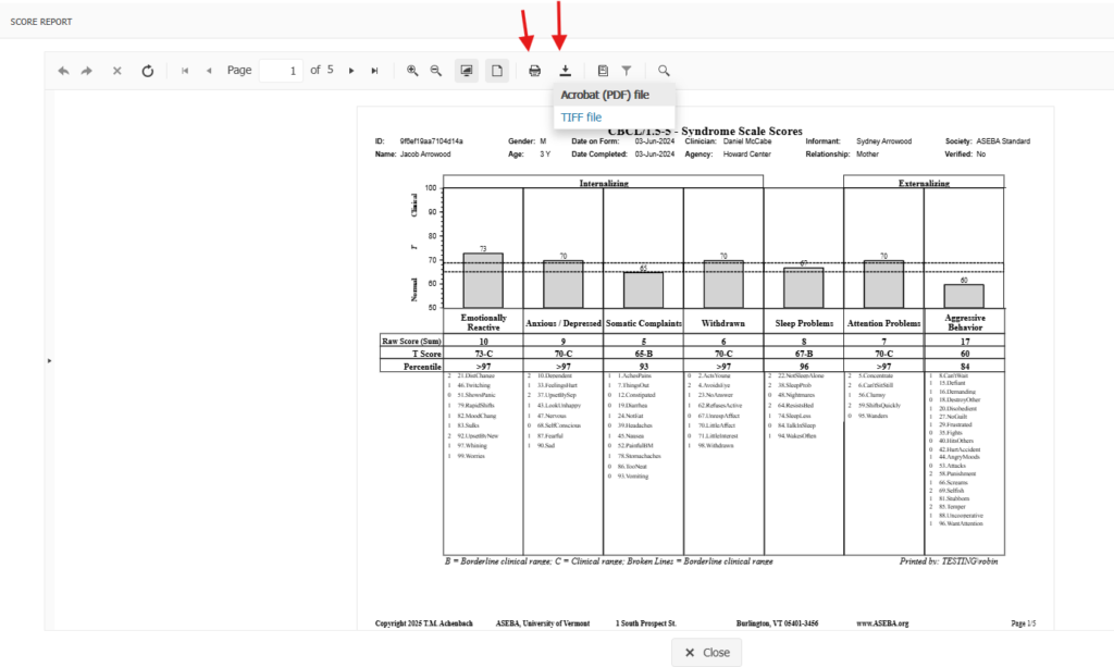 - Click on the assessed person on the left-hand side of the screen, Click on the form to download or print, then click the Score Report button