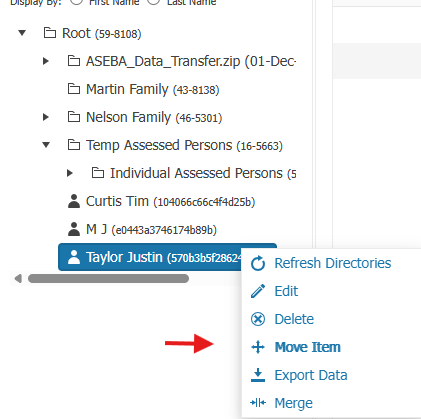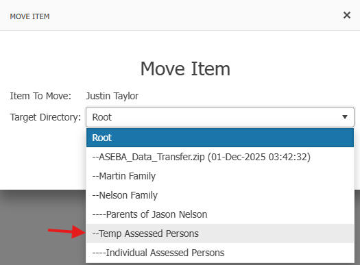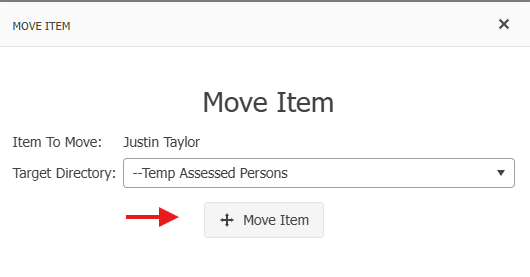 Select the Target Directory to move Assessed Person to, then click on +Move Item: