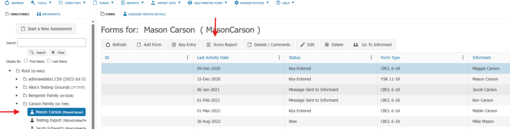 To score and/or view a report, from the DIRECTORIES tab, click on the Assessed Person to highlight them, then select the form you would like to score. Click the Score Report tab.