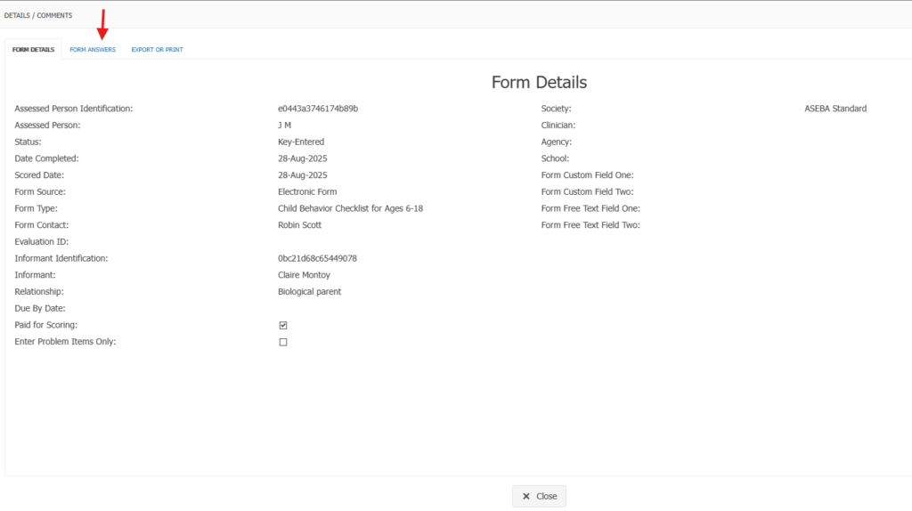To view the open-ended responses to questions on a completed form, click on the assessed person, then click on the form in question, select DETAILS/COMMENTS tab.