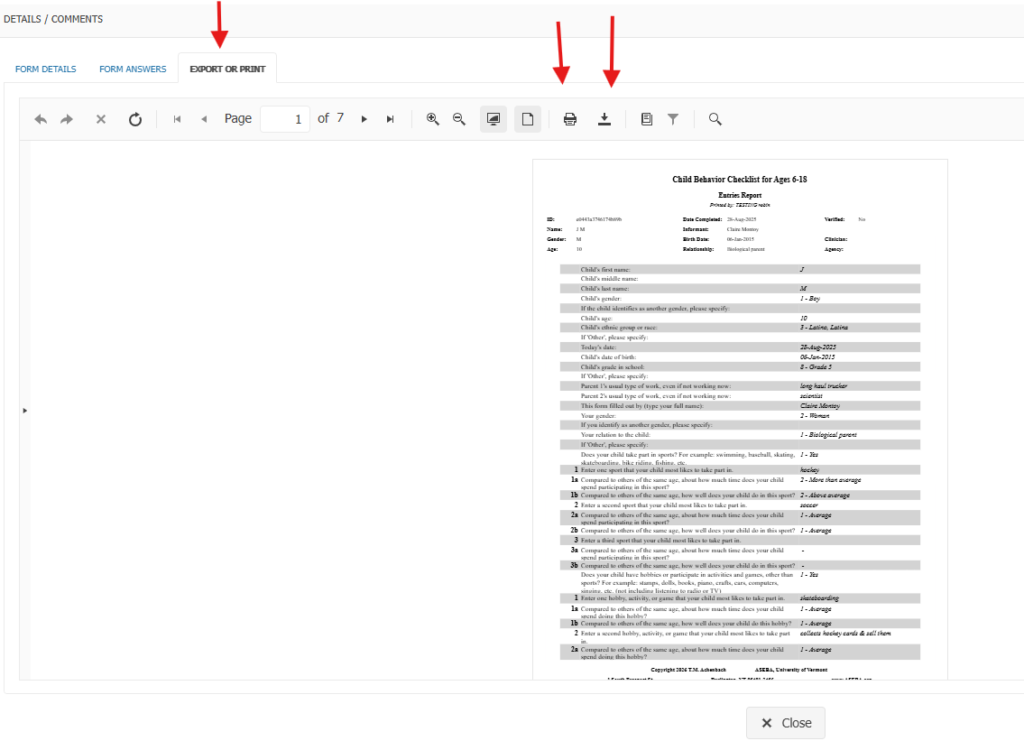 To download and print the responses, click on the EXPORT/PRINT tab. Click on the print icon to print. To download the form, click on the download arrow.