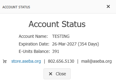 To check your e-units balance, please log into ASEBA-Web, click on the User tab in the upper right-hand corner, and then click on Account Status. The Account Status window will show Account Name, Expiration Date, Days Until Expiration in parentheses, and E-Units Balance.