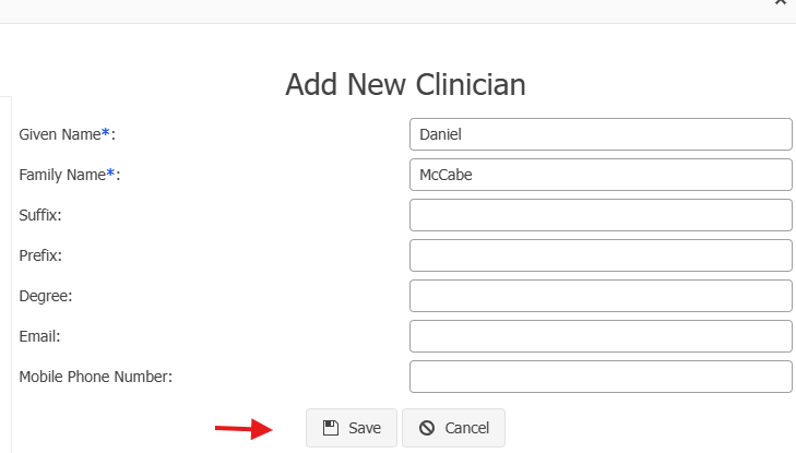 Fill in the information on the clinician. Suffix, Prefix, Degree, Email and Mobile Phone Number are all optional. They are skipped for this example. Click Save.