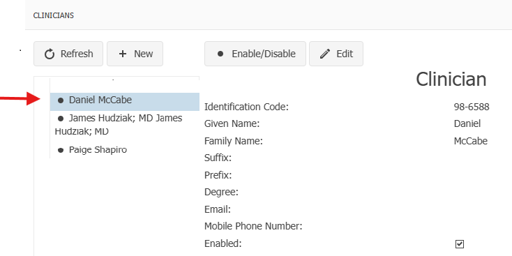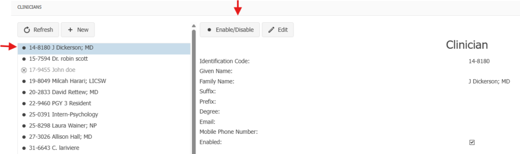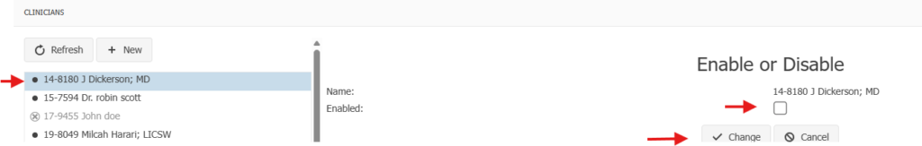 Uncheck the Enabled box and select Change. The clinician’s name will now be faded. The clinician will not show up now in the drop-down list.