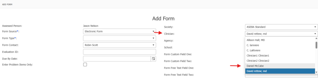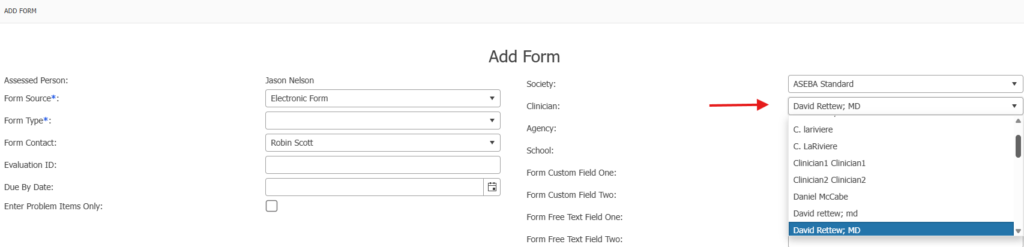 Once the clinician has been added, the clinician’s name will appear in the drop-down list in the ADD FORM window: