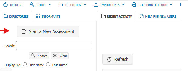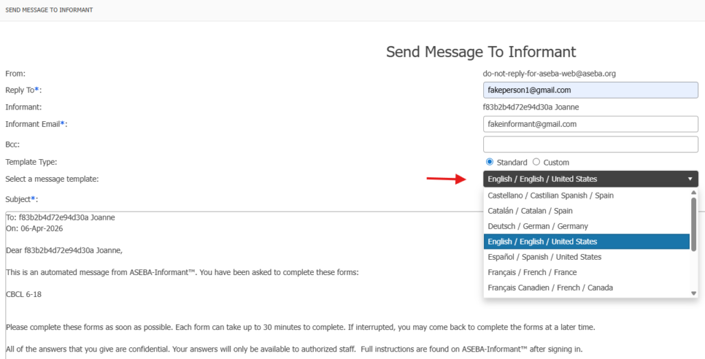 Please use the Start New Assessment wizard to add an Assessed Person, add a Form, and then at the window to Send Message to an Informant, please click on the Select a message template English/Default drop-down arrow to choose other languages.