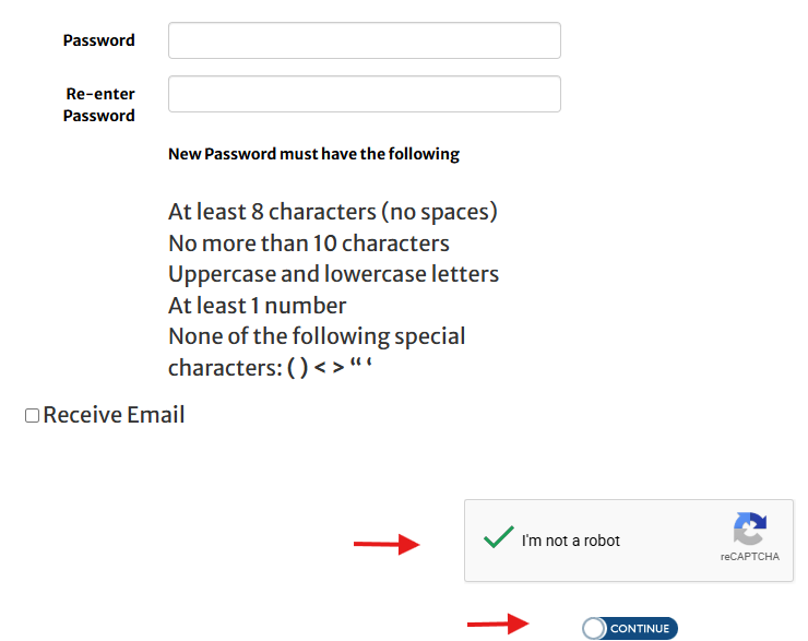 8. Fill in the billing and shipping address. Leave password area blank. If you want to receive an email regarding the order, please check the box Receive Email. Check I am not a robot. Click Continue.