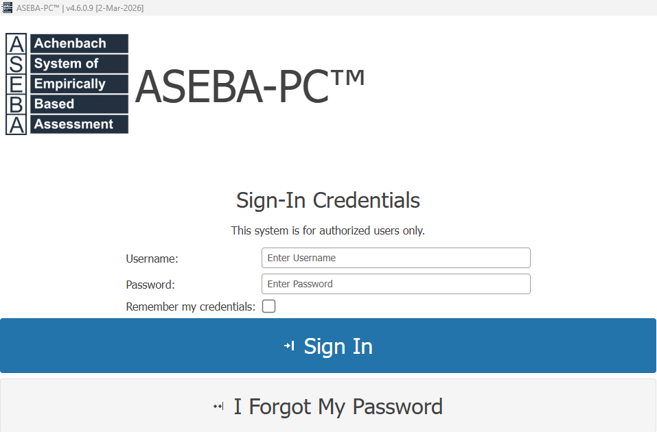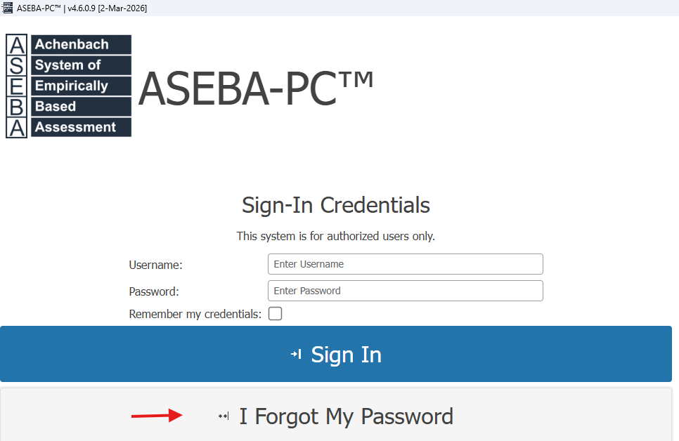 To reset your ASEBA-PC password, please click the “I forgot my password” link under the Sign In tab on the login screen.