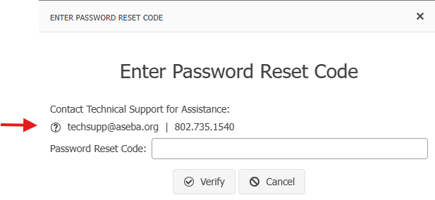 Please email or call ASEBA Technical Support for a Password Reset Code: techsupp@aseba-org or 802-735-1540. Once you receive the Password Reset Code, please enter the code and click Verify.