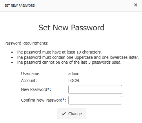 Please choose a new password. The password must be 10 characters long with one uppercase and one lowercase letter. The last 3 passwords cannot be used. Click Change.