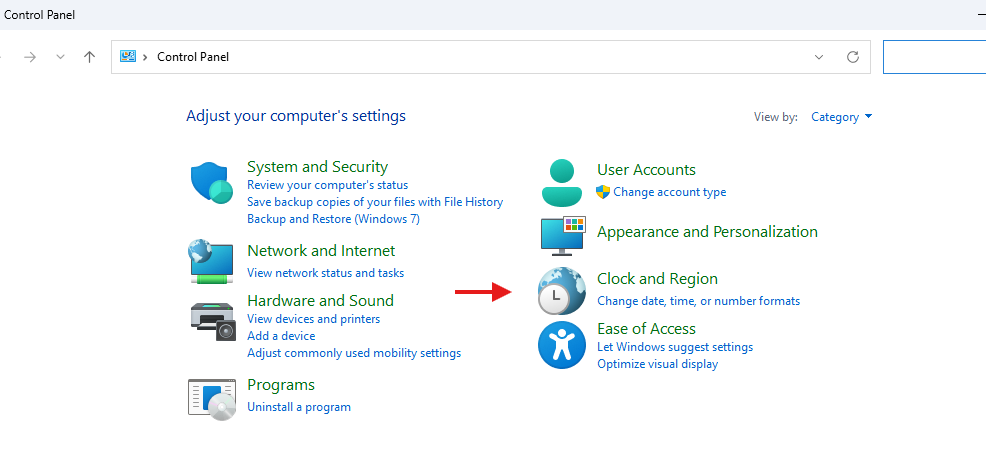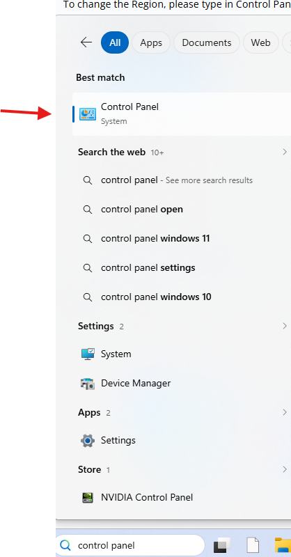 To change the Region, please type in Control Panel in the search area near the start button: