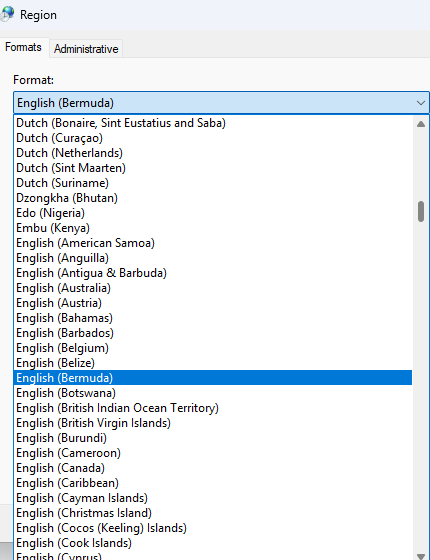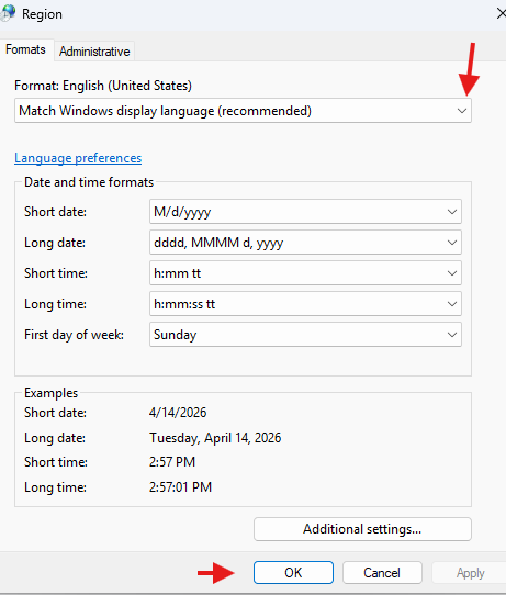 Then, if you see any issues, you can pick and choose date, time and number formats, also in Windows Regional Format Settings.