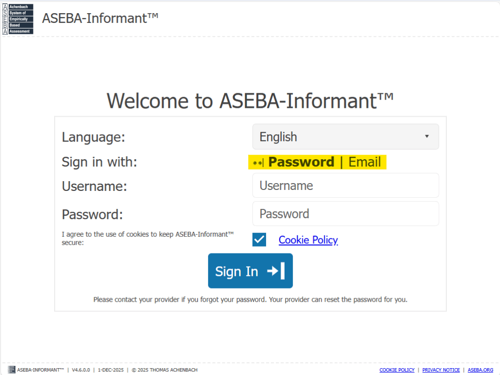 With this version, ASEBA-Informant™ now gives informants the option in the sign-in screen to choose either password or email as their authentication option. Clicking on the highlighted toggle will switch the user between password and email authentication methods: