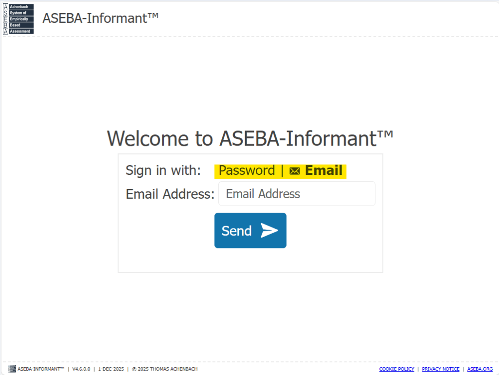 ASEBA-Informant™ has for a long time allowed informants to authenticate and sign in using their email address rather than a username/password combination, but only when clicking on URL link in the notification email that is sent to them.