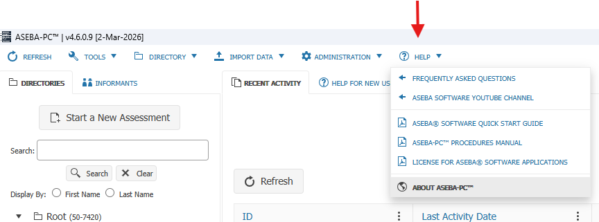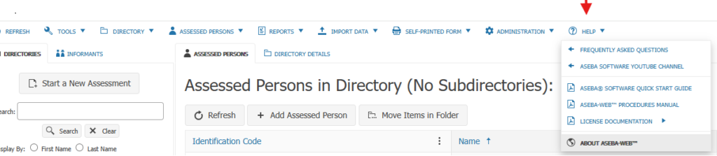 Once logged into ASEBA-Web or ASEBA-PC, in the upper right-hand corner is the HELP tab:
